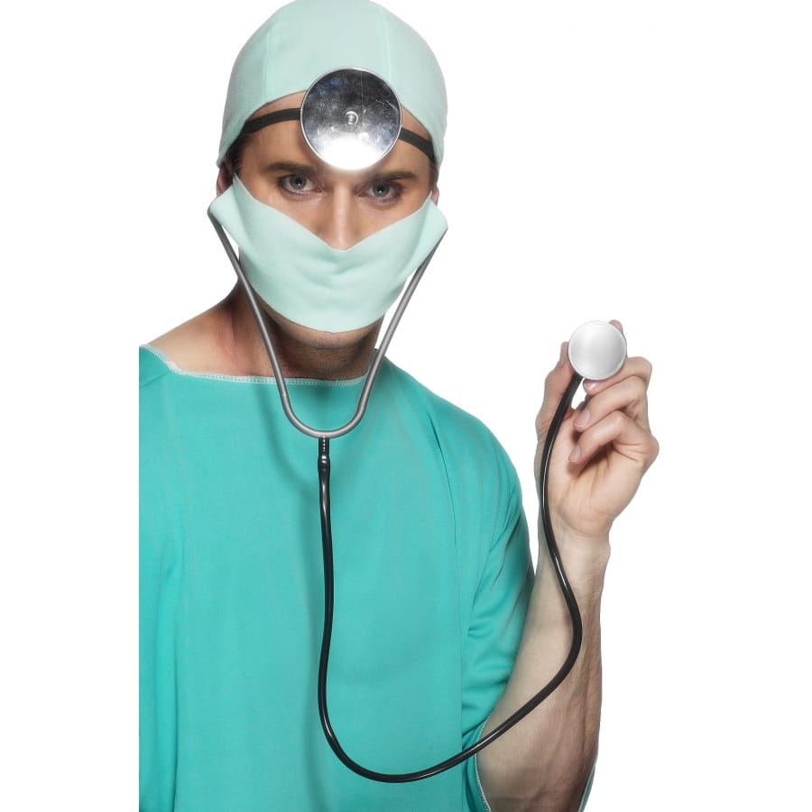 Un masque, un bonnet, une fausse lampe et un stéthoscope. Cet ensemble peut faire de vous un médecin amical pour un carnaval ou un médecin un peu plus effrayant pour la nuit d'Halloween.
