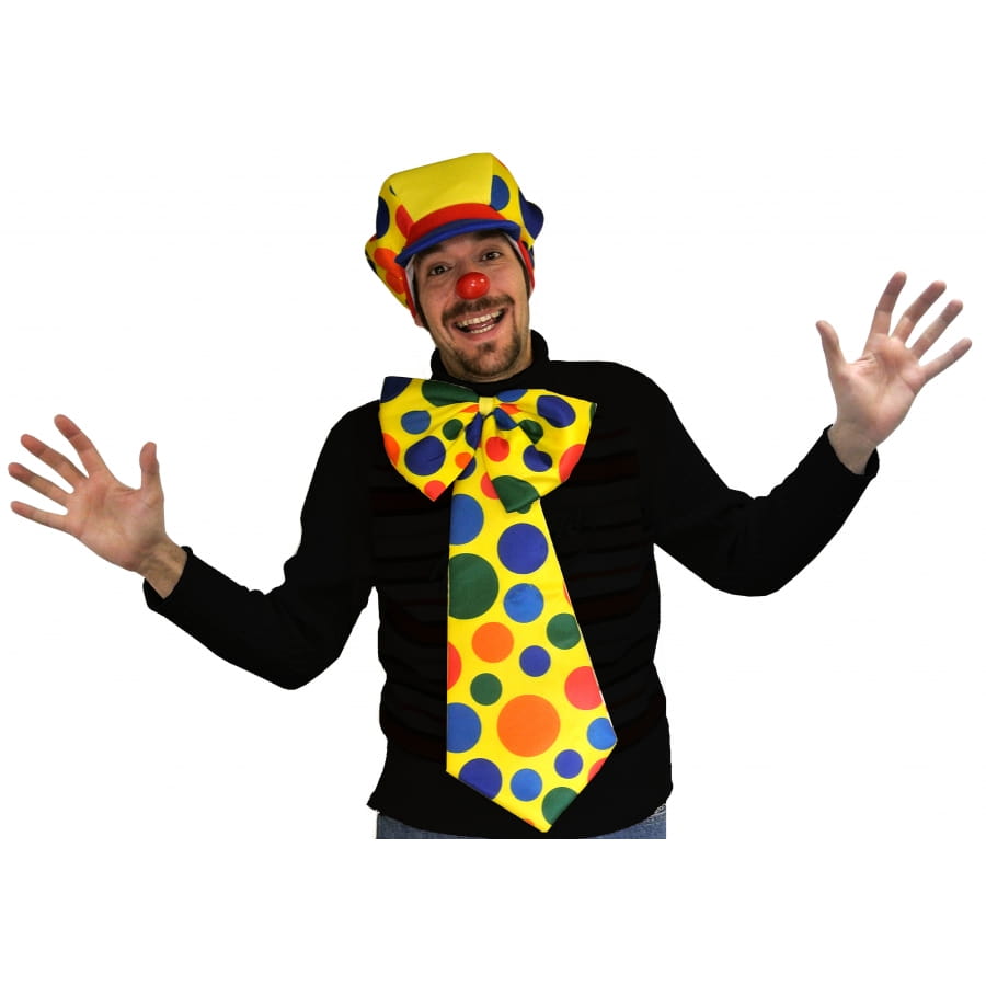 Un clown est toujours drôle dans sa façon de s'habiller ! Voulez-vous essayer ce genre de déguisement lors d'un enterrement de vie de célibataire ? Vous apporterez une ambiance de cirque à la fête. Ce joli set de clown est fait pour vous. Il est composé d'une casquette, d'un gros noeud papillon et d'une énorme cravate assortis. Le tout est en polyester et décoré de pois multicolores dessinés sur un fond jaune éclatant. En parlant d'éclat, vos amis aussi vont éclater... de rire !