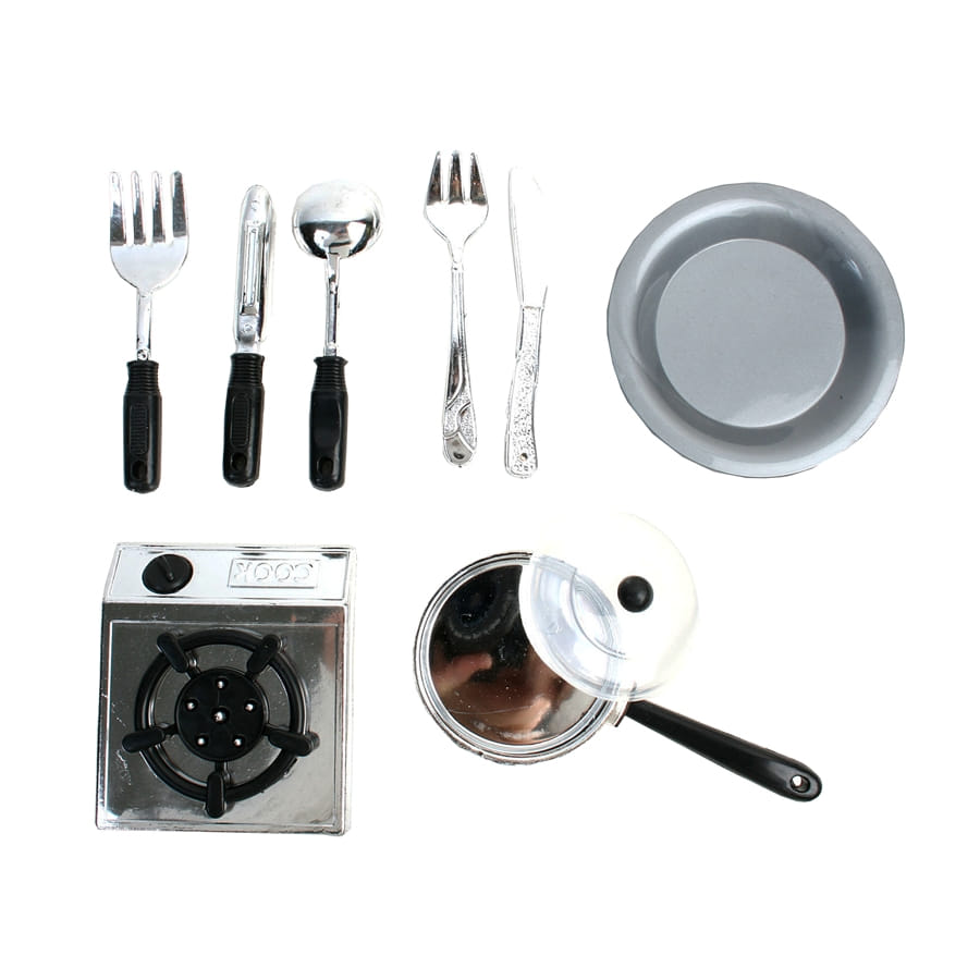 Avec ses couleurs et son aspect moderne, ce jeu de dînette va vous séduire vous et vos enfants. Il s'agit d'un set de dinette aux couleurs inox, composé de neuf magnifiques pièces couleur argent. Vous disposerez ainsi de divers ustensiles comme une poêle, un plat, des couteaux, ou même un réchaud. En route pour de bons petits plats !