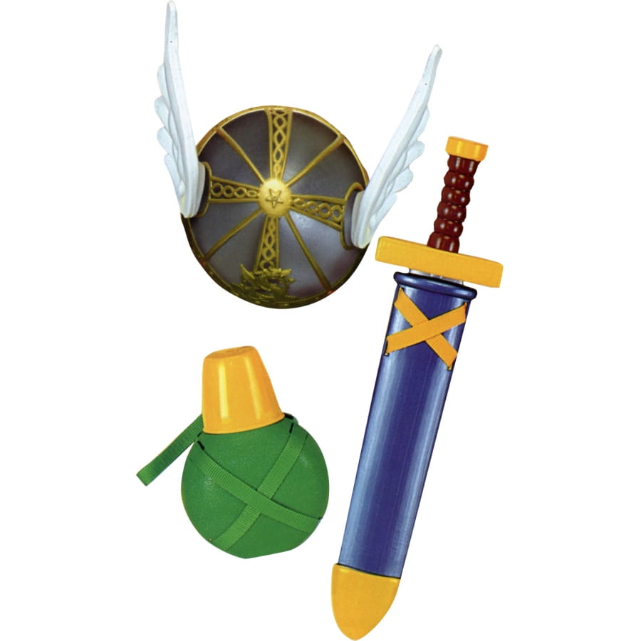 Un set gaulois pour enfant, le casque de couleur dorée et argenté avec des petites ailes blanches de deux coté. Le glaive de couleur bleue avec une manche marron et jaune, la gourde verte avec un bouchon jaune.