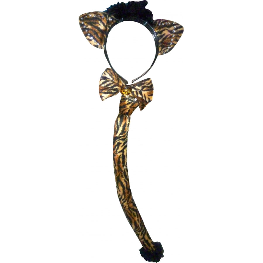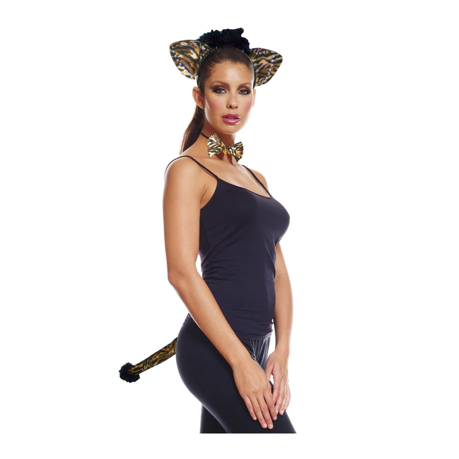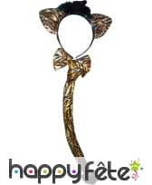 Set de déguisement de léopard pour femme version de luxe beige, marron et noir. Le set est composé d'un noeud, d'une queue et d'un serre-tête avec des oreilles de lépard ornées de petites pierres transparentes. C'est l'idéal pour un carnaval où vous souhaitez vous rendre déguisée en léopard!