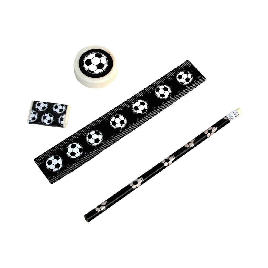 Ce set de papeterie motifs foot a spécialement été créé pour les fanatiques du ballon rond. Il est formé d'un lot de quatre pièces comprenant une règle, une gomme, un taille crayon et un crayon. Le tout est décoré de motifs ballons de foot dans les couleurs noir et blanc.