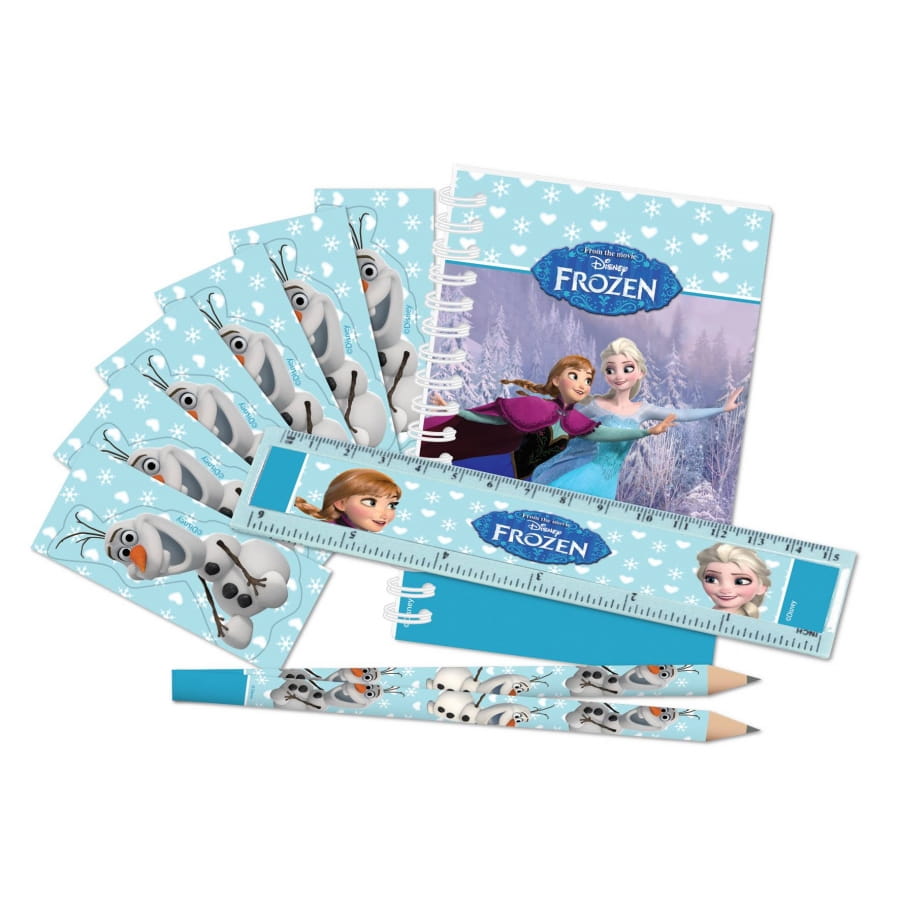 Ce pack est composé de 5 règles imprimées des visages de Elsa et Anna (ces règles mesurent les centimètres et les pouces, de 5 crayons à papier imprimés du bonhomme de neige Olaf, de 5 carnets ornés d'un imprimé représentant Anna et Elsa, et enfin, de 5 étiquettes représentant Olaf tout souriant.