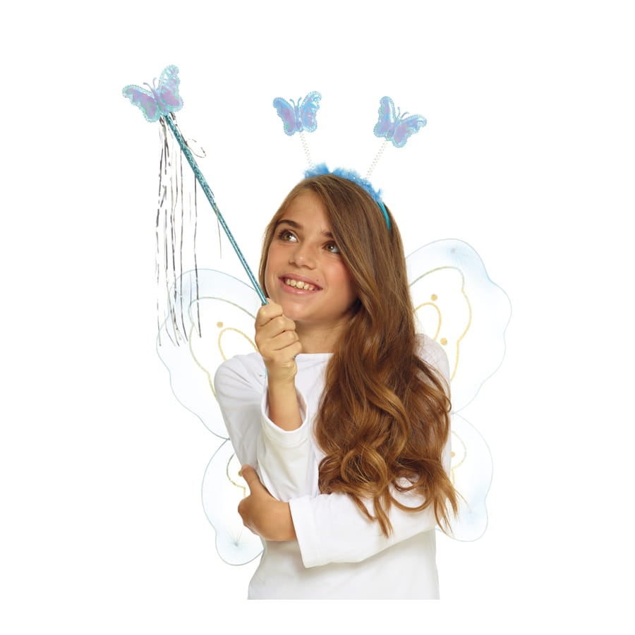 Toutes les petites princesses se trouveront métamorphosées avec ce set de petite fée papillon bleu. Pour devenir un personnage de conte de fée, cet ensemble comprend une paire d'ailes transparentes à bordures bleues, une baguette bleue avec un papillon bleu au bout, et un serre-tête avec deux papillons bleus en guise d'antennes. De belles robes de fée sont aussi disponibles du côté de nos déguisements.