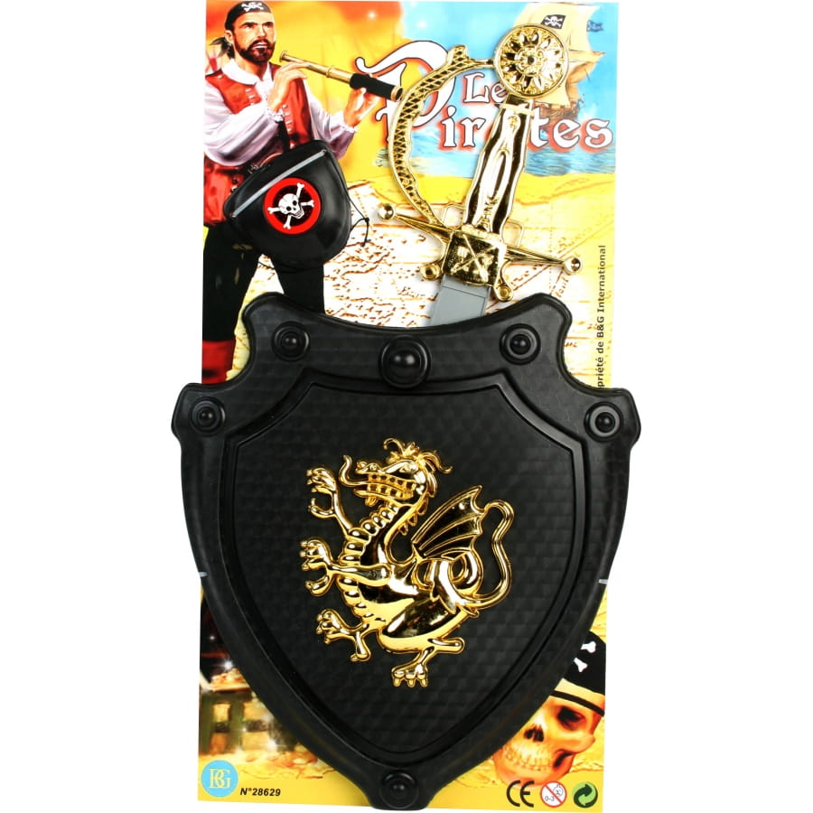 Set de pirate médiéval composé d'une épée grise et dorée et d'un bouclier noir et dorée. L'épée mesure 39 centimètres de longueur. Lors de la commande, il vous sera impossible de choisir ni le modèle ni la couleur. Vous recevrez le set comme présenté. C'est un excellent moyen de compléter un déguisement de pirate.