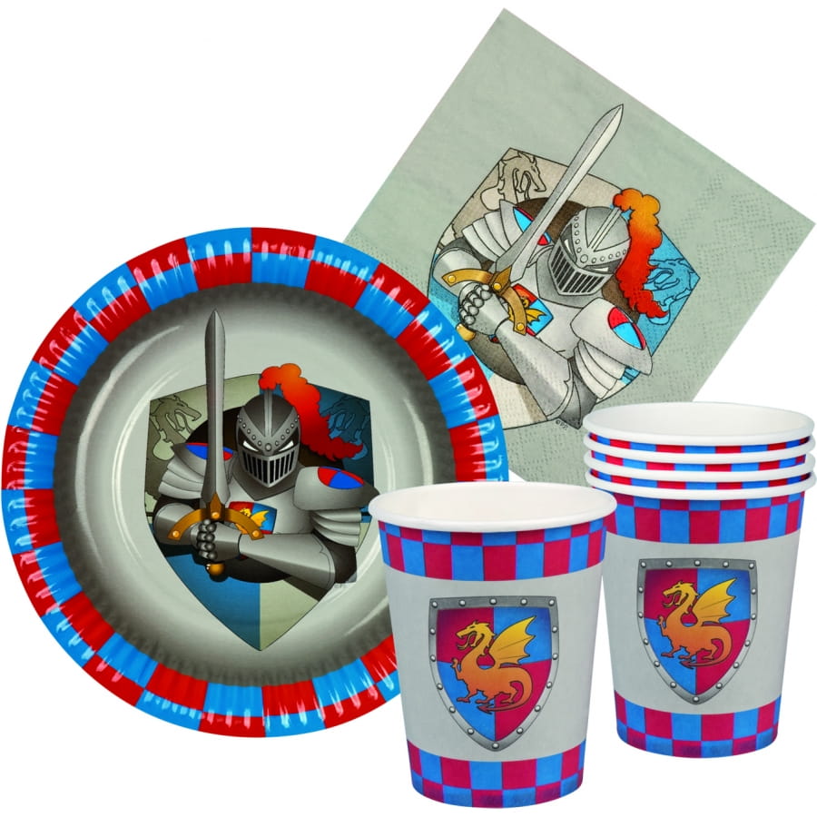 Set de table chevaliers et dragons composé de 6 gobelets, de 6 assiettes et de 12 serviettes, tous en carton. Les gobelets sont imprimés de dragons sur bouclier, tandis que les serviettes et les assiettes sont imprimées de chevaliers. Servez-vous-en à l'occasion d'anniversaire d'enfants ou de fêtes médiévales.