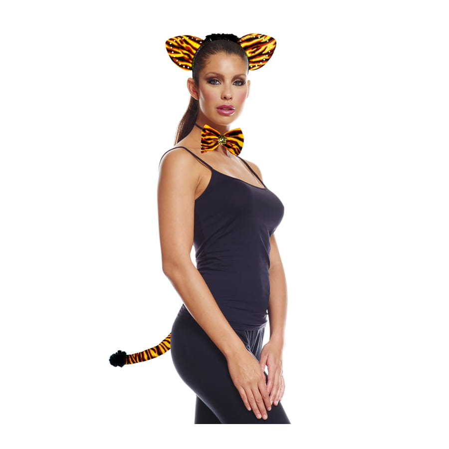 Set de déguisement de carnaval beige et marron pour femme, composé d'un serre-tête avec oreilles, d'une queue et d'un noeud. Les oreilles sont ornées de petites pierres et le noeud, d'une grosse pierre. C'est l'ensemble idéal pour vous faire passer pour une tigresse!