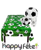 - une nappe décorée de motifs de ballons blancs et noirs sur fond de pelouse verte.