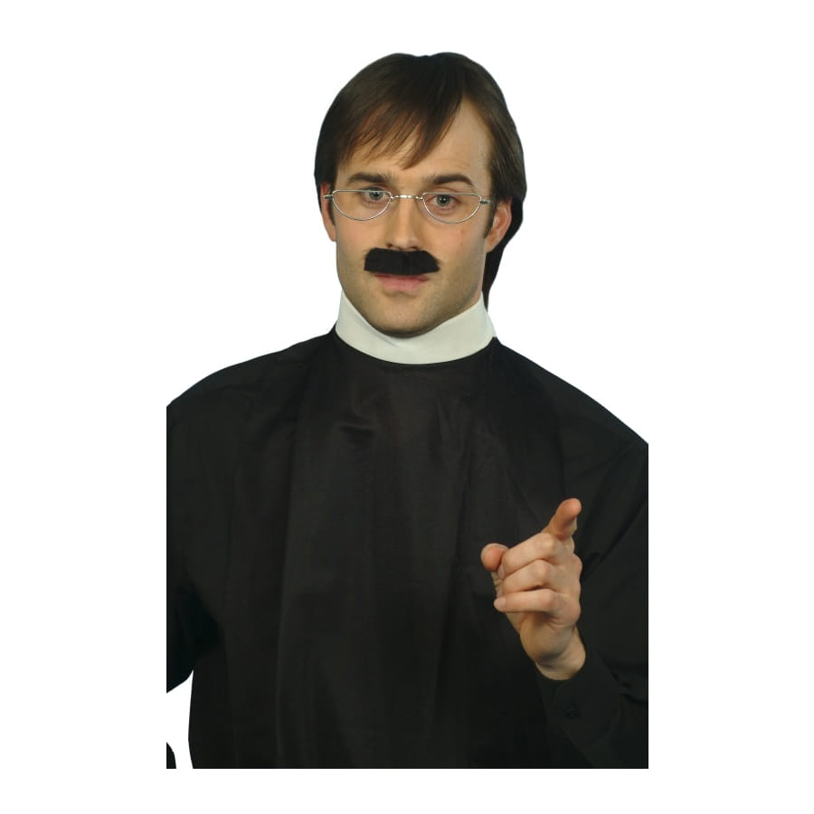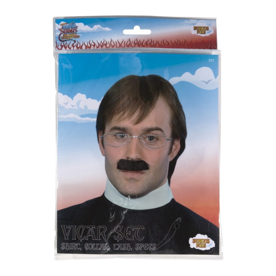 Bien que peu commun, certains choisissent de se mettre dans la peau d'un religieux à l'occasion d'une fête à thème. Alors, si on fait les choses, autant les faire bien. Incarnez le parfait vicaire avec ce set composé d'une chemise noire pour la tenue, et du fameux col blanc de religieux. Ce costume serait idéal pour le carnaval ou un enterrement de vie de garçon ou de jeune fille. Les lunettes ainsi que la moustache font partie du kit. Vendu dans une pochette en plastique.
