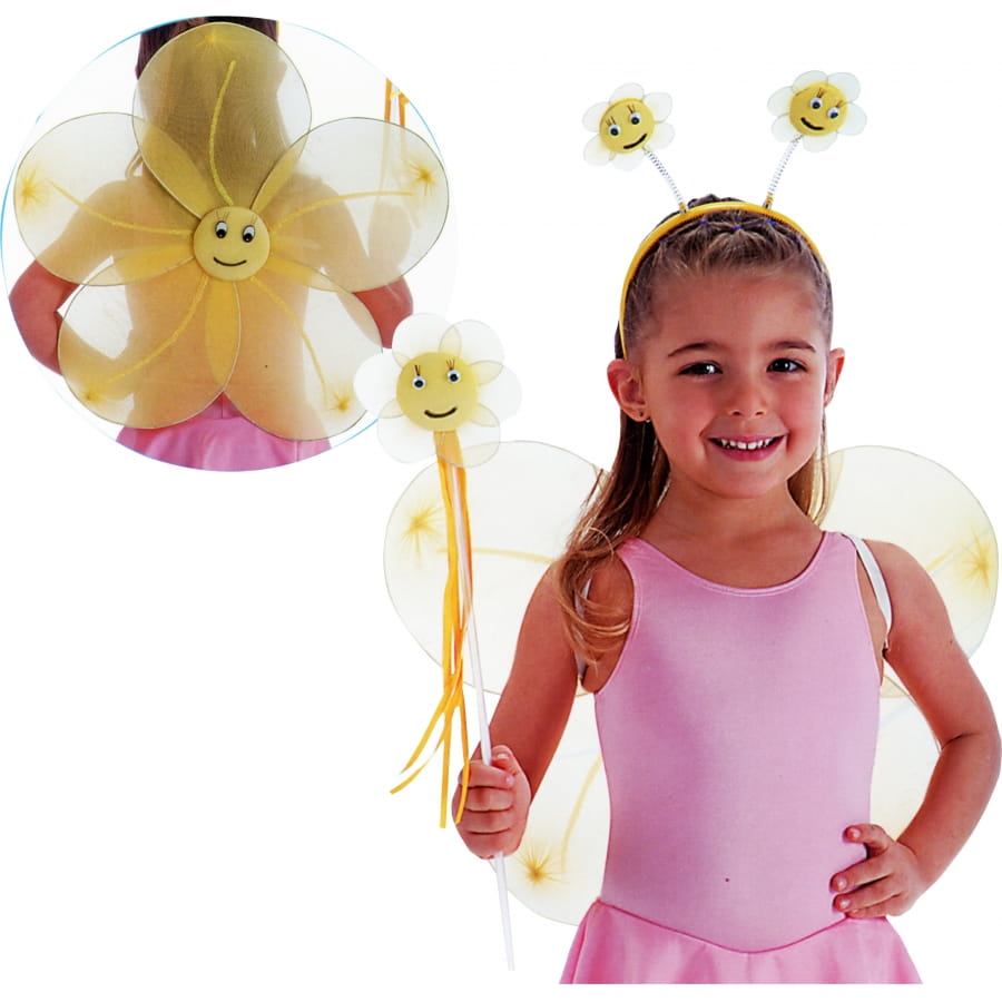 Voici un set de déguisement qui plaira tout particulièrement à votre fille. Adoptant le thème de fleur, ce set est proposé en couleur jaune. Il comprend une baguette avec une fleur au bout, un serre-tête avec deux fleurs et une paire d'ailes jaunes en forme de fleur. Les ailes mesurent environ 45 centimètres et sont semi-transparentes. Le choix du modèle et de la couleur ne sont pas disponibles. Avec ce déguisement, votre fille sera sans aucun doute la plus mignonne de toutes.