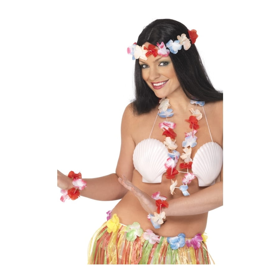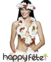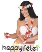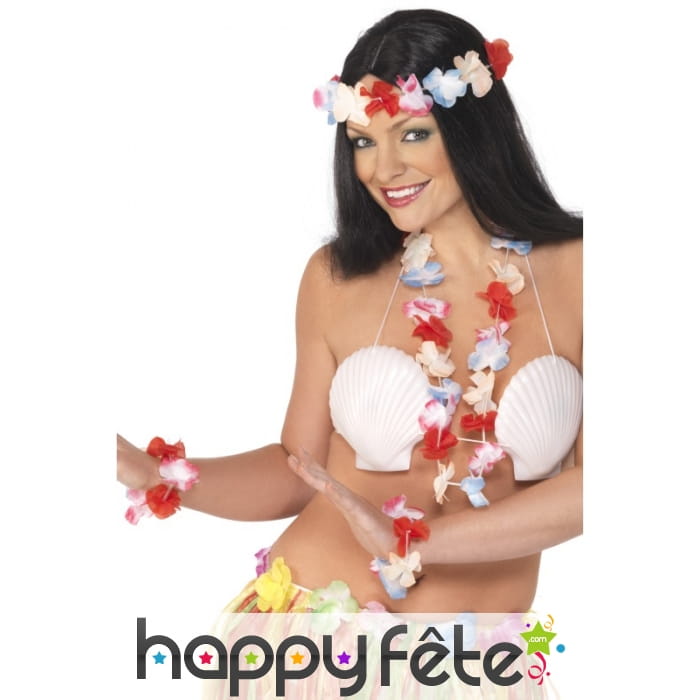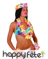 Set hawaïen tissu, pour femme, composé d'un serre-tête, d'un collier et d'une paire de bracelets. Chacun des accessoires est composé de fleurs multicolores. Ils vous donneront un air très exotique pour une fête basée sur le thème d'Hawaï ou des Antilles.