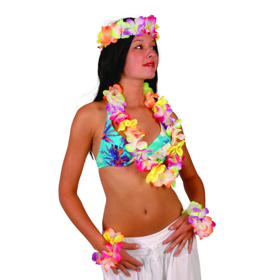 Set de déguisement Hawaïen, pour homme ou femme, composé d'un collier, d'une couronne et de deux bracelets fleuris multicolores. Cet ensemble d'accessoire est parfait pour un carnaval exotique, hawaïen ou antillais.