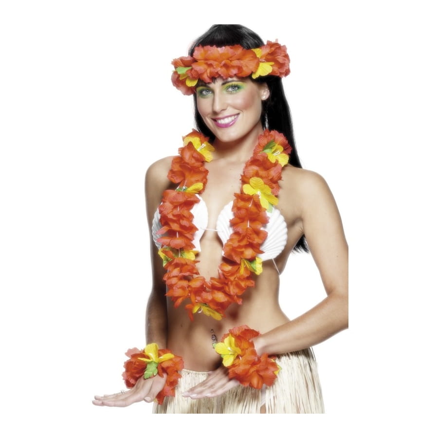Set hawaïen en tissu de couleur rouge, pour femme, composé d'une couronne, d'un collier et de deux bracelets. Les accessoires sont en fait des fleurs, ce qui ira parfaitement à un thème de soirée exotique.