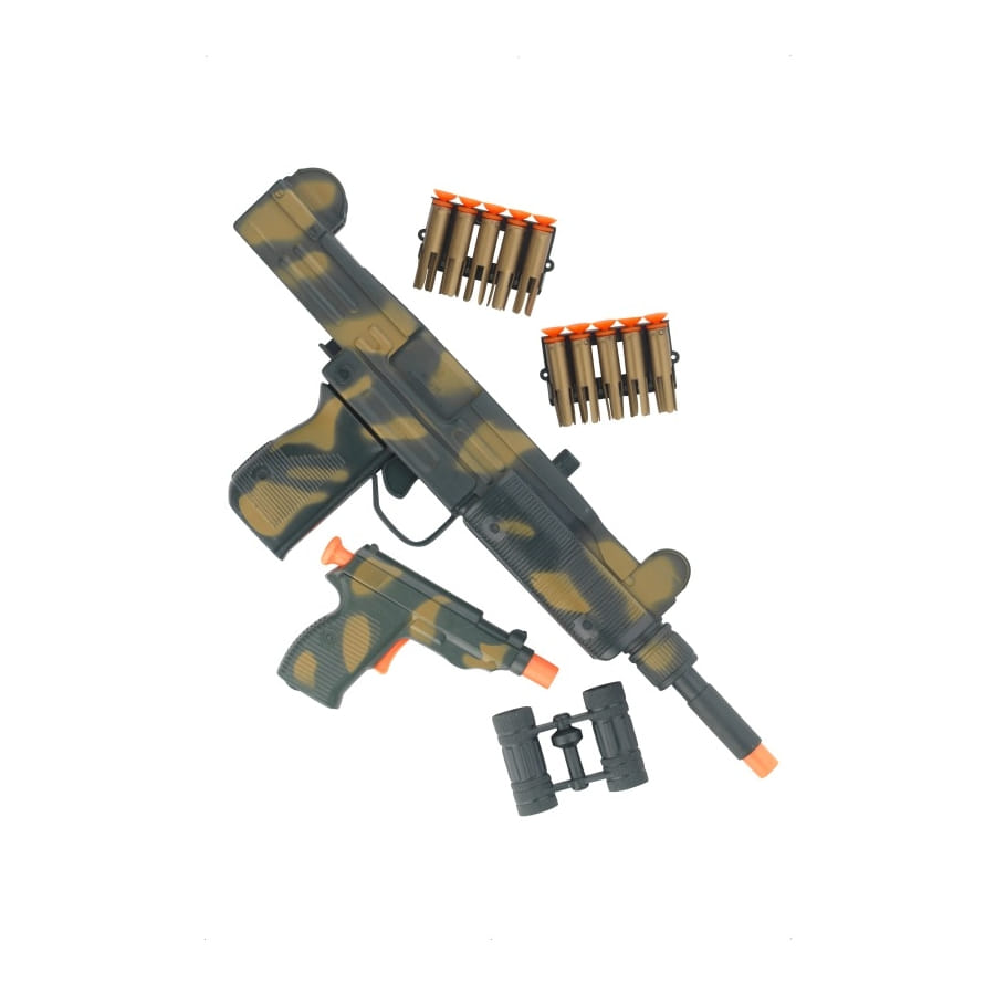 Il va être le soldat le plus redouté avec cet set mitraillettes. Même monsieur pourra s'en servir comme accessoire s'il incarne un soldat ou guerrier. Ce set est composé d'un fusil vert et marron, d'une mitraillette de la même couleur , de munitions et de jumelles.
