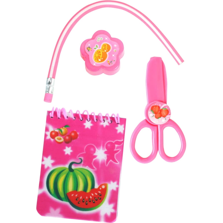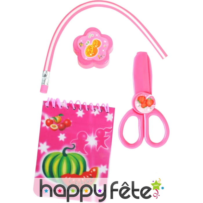 Set de papeterie rose "Miss Théa" composé de 4 pièces et mesurant 10 sur 7 centimètres. Le set contient un crayon, une gomme, une paire de ciseaux, un bloc-note et un taille-crayon. Au moment de votre commande, vous ne pourrez choisir ni le modèle ni la couleur du set et le recevrez comme présenté. Il sera idéal pour la égayer votre fille lors de la rentrée des classes.