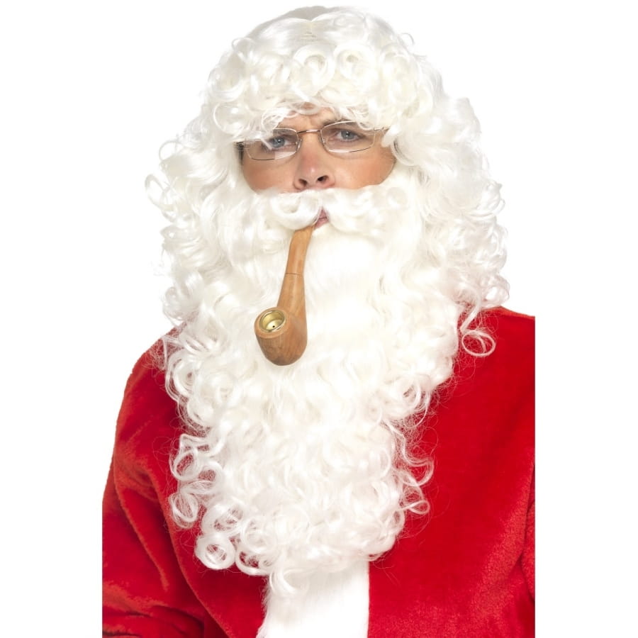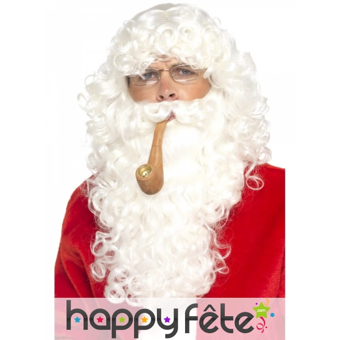 Set de déguisement de Père Noël, pour homme, composé d'une paire de lunettes, d'une pipe brune et d'une longue barbe bouclée de couleur blanche. Ce set est parfait pour animer une fête de Noël où se trouveront beaucoup d'enfants.