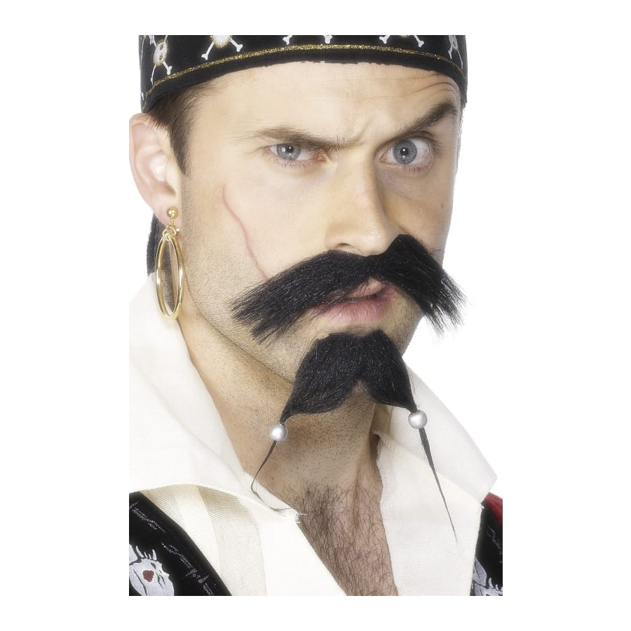 Ce set de pirate vous apportera une touche de plus à votre déguisement de pirate. Tout le monde sera ébloui par votre déguisement. Il est composé d'une moustache de couleur noir, d'une barbe noir qui est séparé en deux et maintenu par deux perles.
