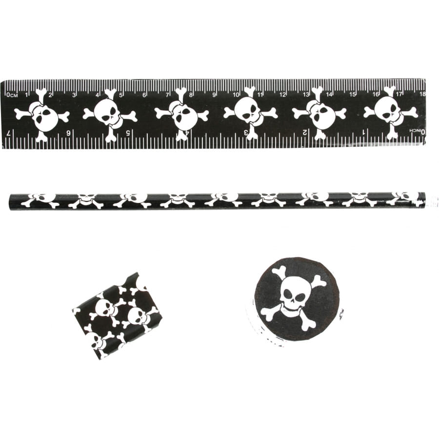 Set de papeterie spéciale pirate de 19 centimètres. Le set comporte 4 pièces dont une règle de 15 centimètres, un crayon, une gomme et un taille-crayon, tous de couleur noire avec des têtes de morts imprimées en blanc. Lors de la commande, vous ne pourrez choisir ni le modèle ni la couleur des accessoires. Vous les recevrez comme présentés. Ce set sera parfait pour la rentrée des classes.