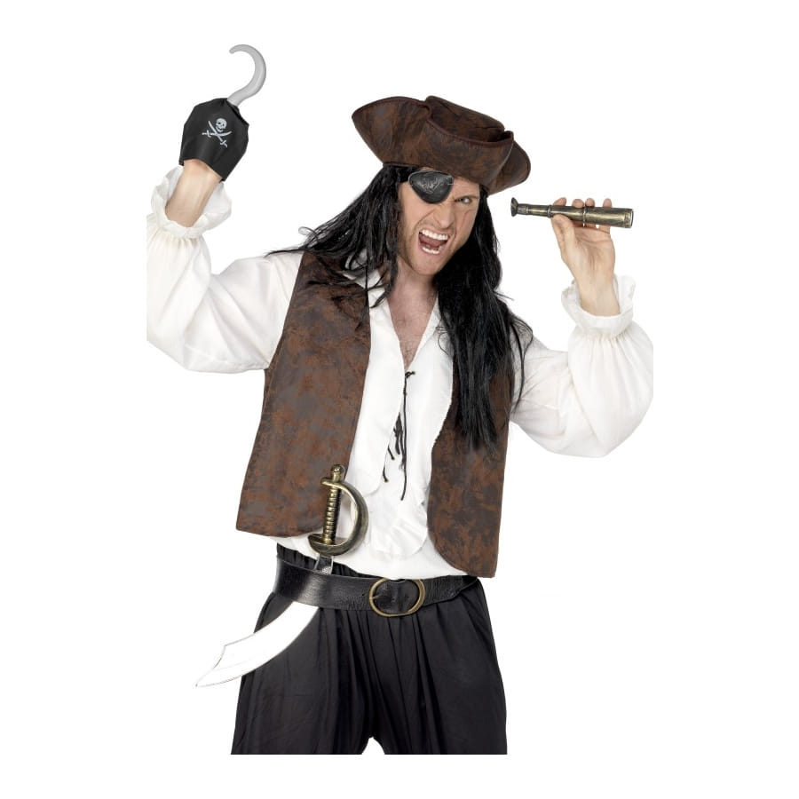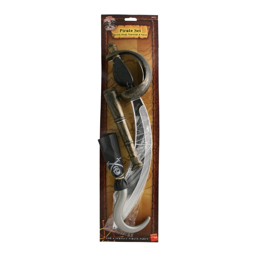 Set de pirate pour homme ou adolescent composé d'un sabre, d'un crochet, d'une longue-vue et d'un cache-oeil. Ajoutez-y un des tricornes proposés et vous aurez un déguisement de pirate parfait.