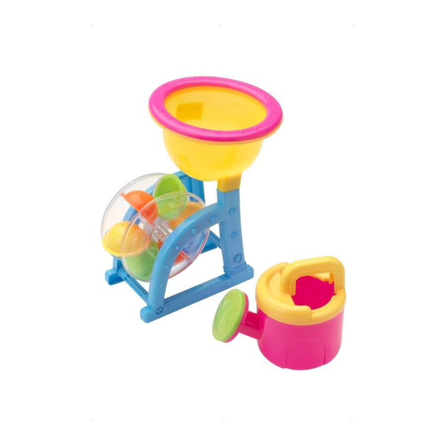 Set de plage pour enfant composé d'un moulin à eau rose, bleu et jaune et d'un arrosoir vert, rose et jaune. Emportez avec vous ce set pour que vos enfants puissent profiter au maximum de leur journée à la plage.