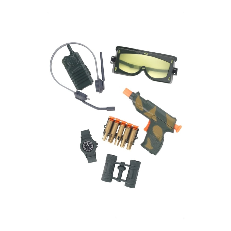 Votre enfant sera le parfait militaire avec ces accessoire. Il pourra le porter pour compléter son déguisement de militaire. Il est composé d'une radio de couleur noire, d'une paire de lunette noir et vert, de munitions, d'un fusil noir et vert, d'une montre, et de jumelles.