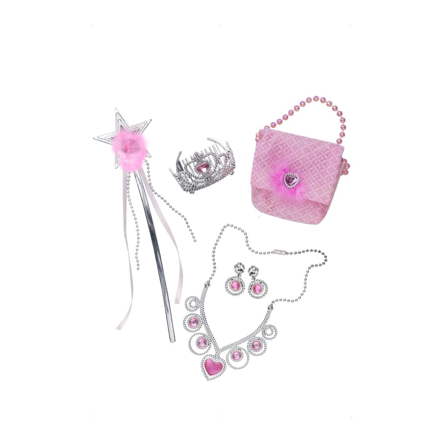 Ce set de princesse ira très bien à votre princesse. Elle pourra le porter pour se transformer en princesse ou encore pour un gouter d'anniversaire. Ce set est composé d'un collier argenté avec un cœur au centre, de boucle d'oreilles argenté et rose, d'un sac rose avec une manche en perle, d'un diadème argenté ainsi qu'une baguette magique avec une étoile à l’extrémité.