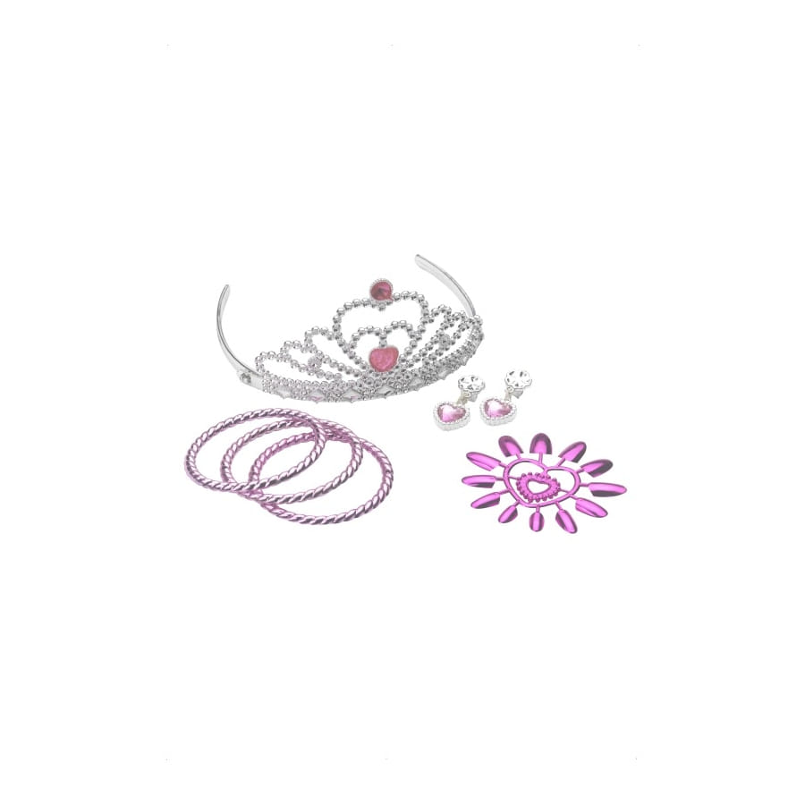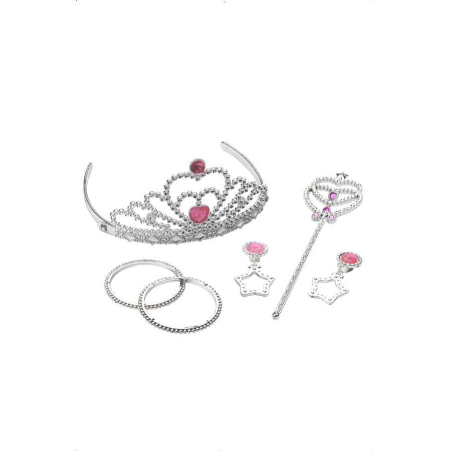 Ce set est composé d'un diadème argenté et rose, de bracelet rose, des faux ongles rose et d'une paire de boucle d'oreilles.