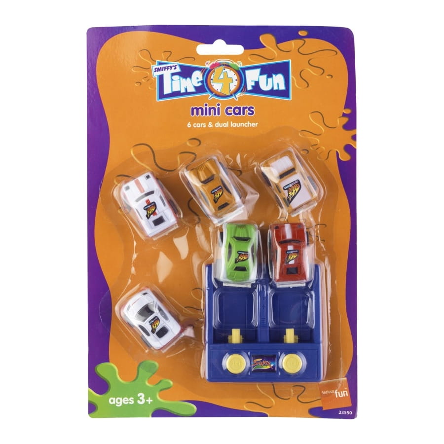 Set de racing, pour enfants, composé de 6 petites voitures ainsi que d'un propulseur. Placez les voitures sur le propulseur et lancez-les en pressant le bouton jaune pour qu'elles fassent la course. C'est un jeu très amusant à jouer seul ou accompagné.