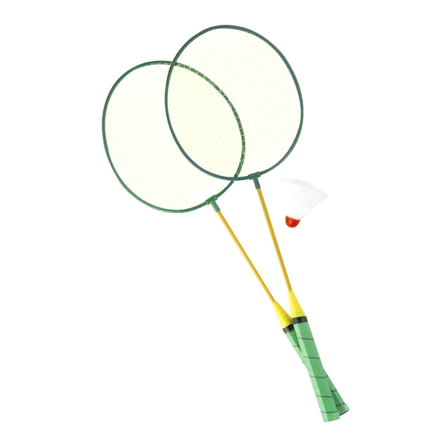 Set de badminton complet composé de 2 raquettes jaunes et vertes et d'un volant rouge et blanc. Dégourdissez-vous les jambes avec ce sport classique.