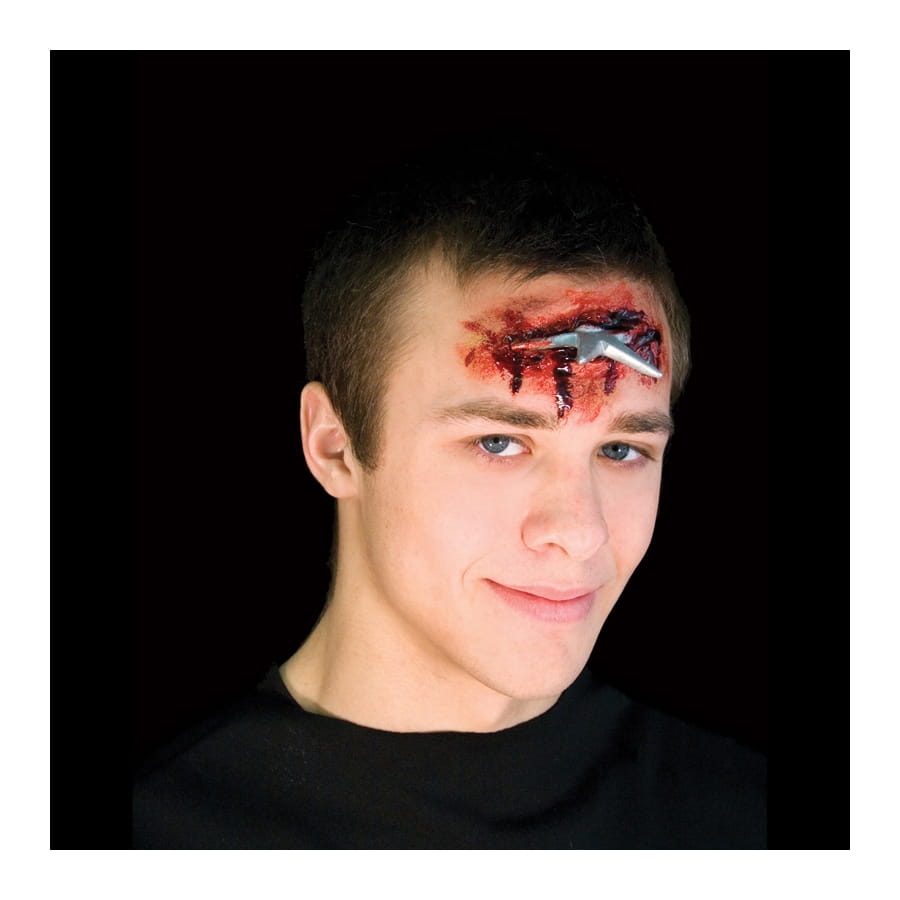 Cette fausse cicatrice avec faux shuriken gris plus vrai que nature simulera la perforation de votre peau par un shuriken de ninja métallique. Spectaculaire non ? Choisissez d'abord l'endroit où vous voulez l'appliquer, sur le visage par exemple, ou le bras, puis mettez de la colle sur la peau et/ou sur la prothèse et tamponnez. Rajoutez du latex liquide sur les bords pour obtenir un meilleur résultat. Un peu de maquillage et de faux sang, que vous découvrirez également sur notre site, le complèteront à merveille. Cela donnera l'impression que la plaie est réelle et que le sang dégouline. Vous pourrez ainsi effrayer vos amis et tout votre entourage le soir d'Halloween ou à l'occasion d'une soirée Horreur entre amis.