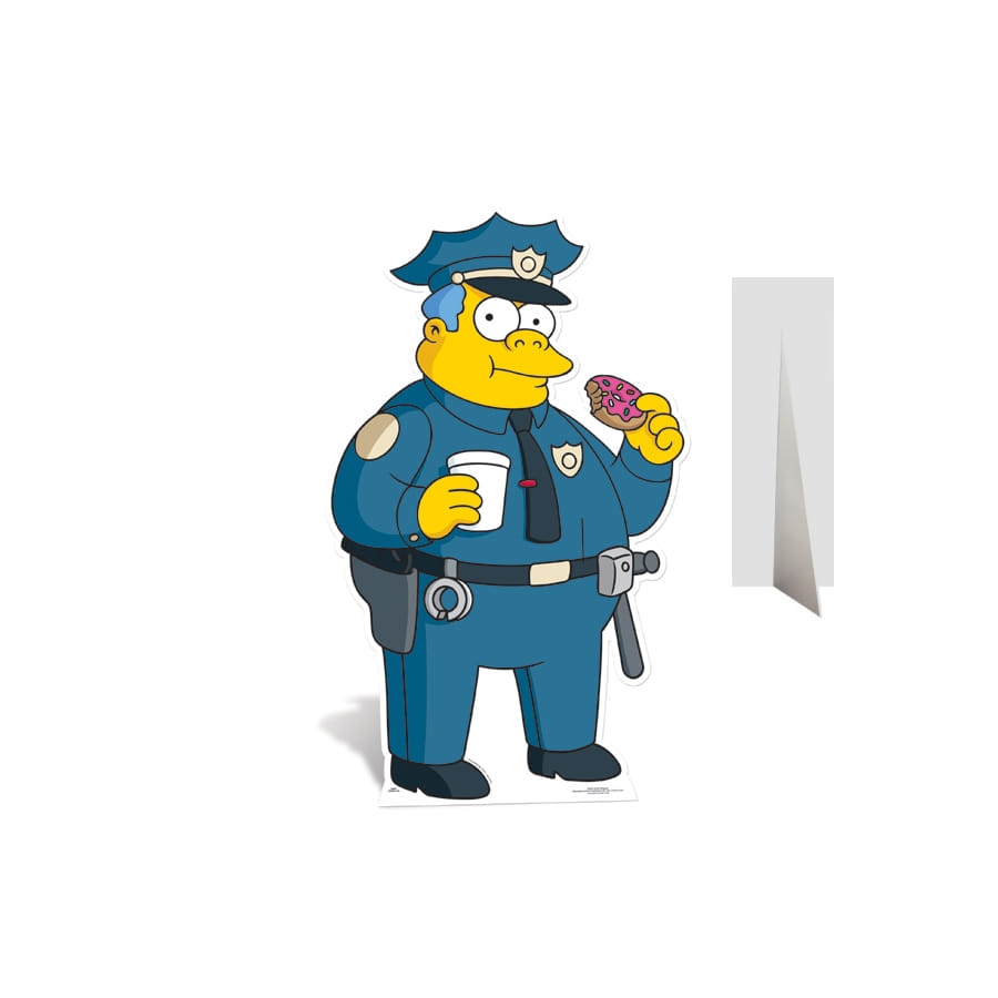Elle est géante cette silhouette chef Wiggum en carton, car elle a une hauteur de 138 cm. Nous y voyons un chef Wiggum de couleur jaune, bleue et noire, mangeant un donut et buvant son café. La silhouette est évidemment sous licence Les Simpsons, avec la qualité qu'il se doit.