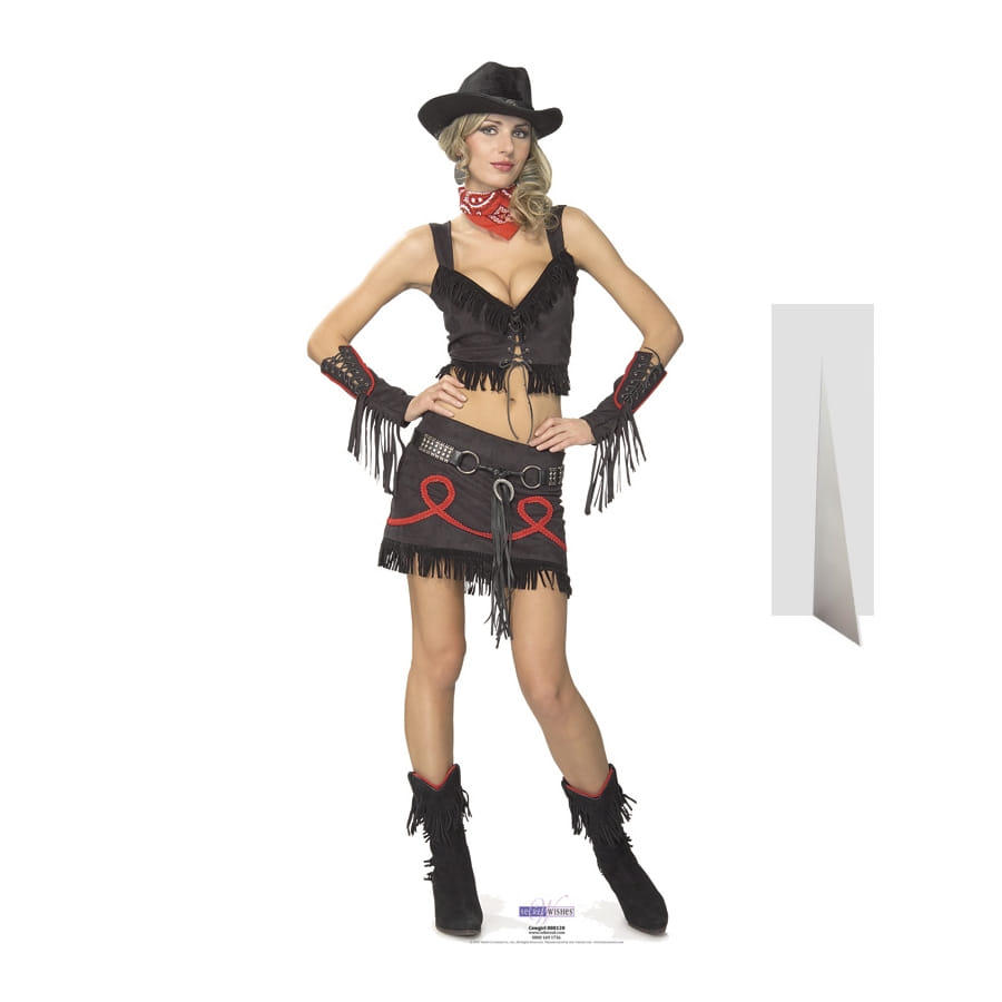 Cette silhouette de cow-girl en carton plat représente une cow-girl sexy vêtue d'un haut décolleté et d'une mini-jupe de couleur noire et rouge. Une de celle que l'on inviterait bien à notre fête spéciale western si on la voyait dans les parages. Sinon, on peut toujours décorer la salle avec cette silhouette de 171 cm de haut, avec laquelle tout le monde peut prendre des photos.