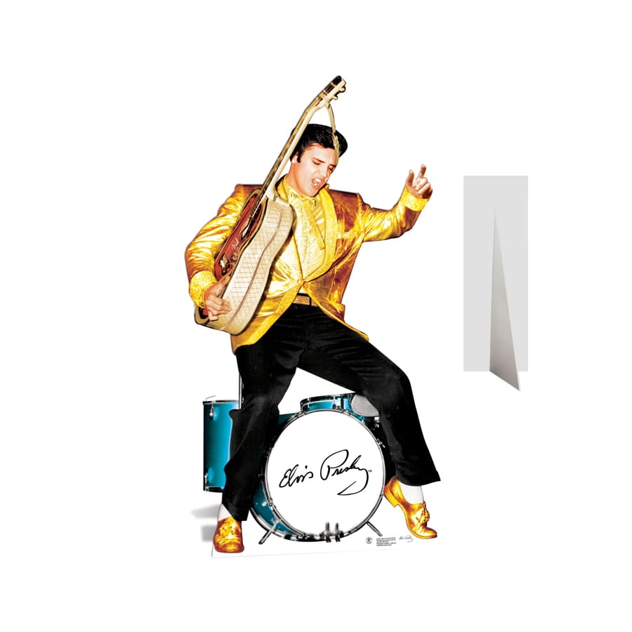 Cette silhouette de Elvis en concert, carton plat représente Elvis Presley, l'un des chanteurs américains les plus connus de la planète, en plein show dans son costume de scène doré, avec sa guitare et sa batterie. Cette décoration mesure 185 x 99 cm, et est sous licence officielle Elvis Presley. Pour toutes vos soirées à thème Célébrités, Musique ou Rock'n roll, mais aussi pour les grands fans du King, cette magnifique silhouette sera une décoration fascinante.