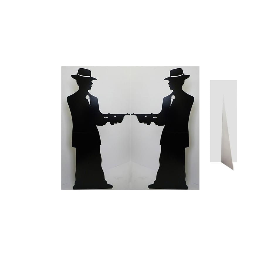 Si vous voulez un article de décoration assez classe pour une fête à thème gangster, nous avons ce qu'il vous faut. En effet, cette silhouette de gangster en face à face est parfaite pour cela. Elle est de couleur noire et blanche et vous verrez dessus deux gangsters armés face à face. Cette figurine géante double pack est en carton et mesure 185 cm de haut.