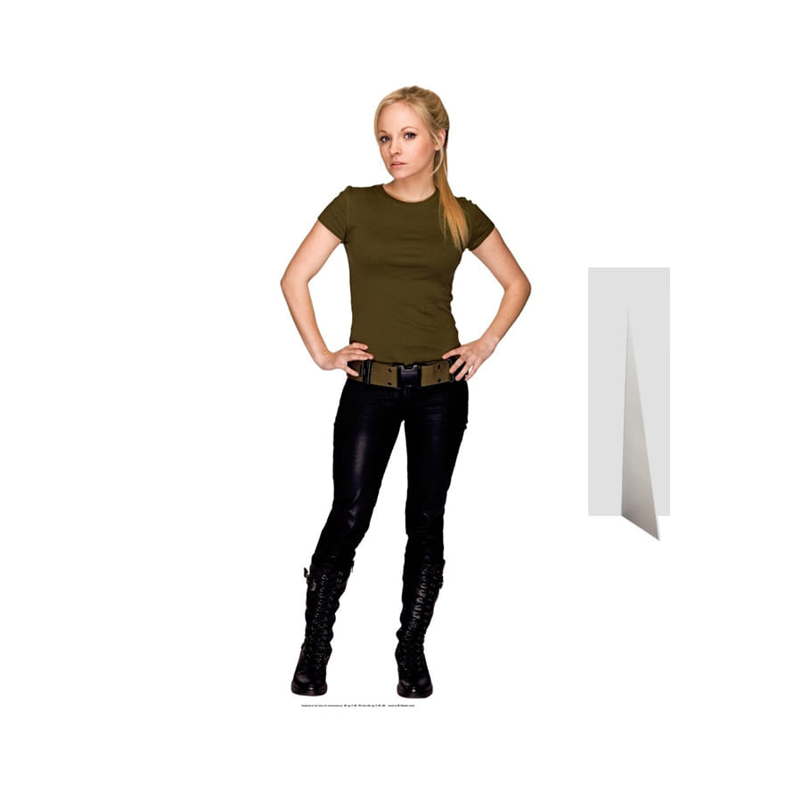 Pour votre fête à thème, la décoration de votre chambre ou tout simplement pour un cadeau unique pour une personne exceptionnelle, nous vous proposons cette silhouette de Jenny, doctor Who autoportante taille réelle de 159 cm. Sur la photo, la jolie blonde porte un t-shirt kaki et un pantalon moulant en cuir noir.