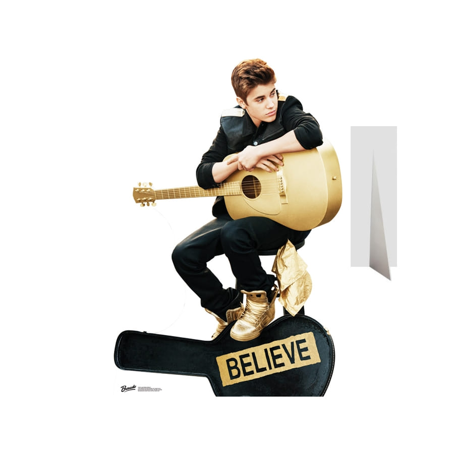 Vu le grand nombre de fans qu'a Justin Bieber, nous sommes sûrs que cette silhouette de Justin Bieber et sa guitare se vendra comme des petits pains. De plus, cette figurine en carton présente une magnifique photo de lui tout de noir vêtu avec sa guitare, et ses chaussures qui sont de couleur marron. Mieux encore, elle est de taille réelle car a une hauteur de 150 cm et une largeur de 102 cm.