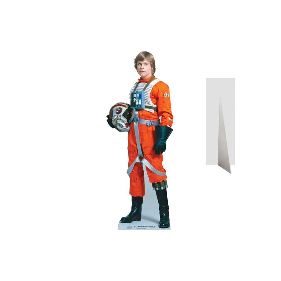 Nous voyons très bien cette silhouette de Luke Skywalker pilote trôner parmi les décorations d'une fête à thème Star Wars. En effet, cette figurine décorative est en carton et représente la photo de Luke Skywalker avec sa combinaison et son casque de pilote de couleur orange, noire et blanche. Elle a une hauteur de 184 cm et une largeur de 68 cm et est sous licence Star Wars.