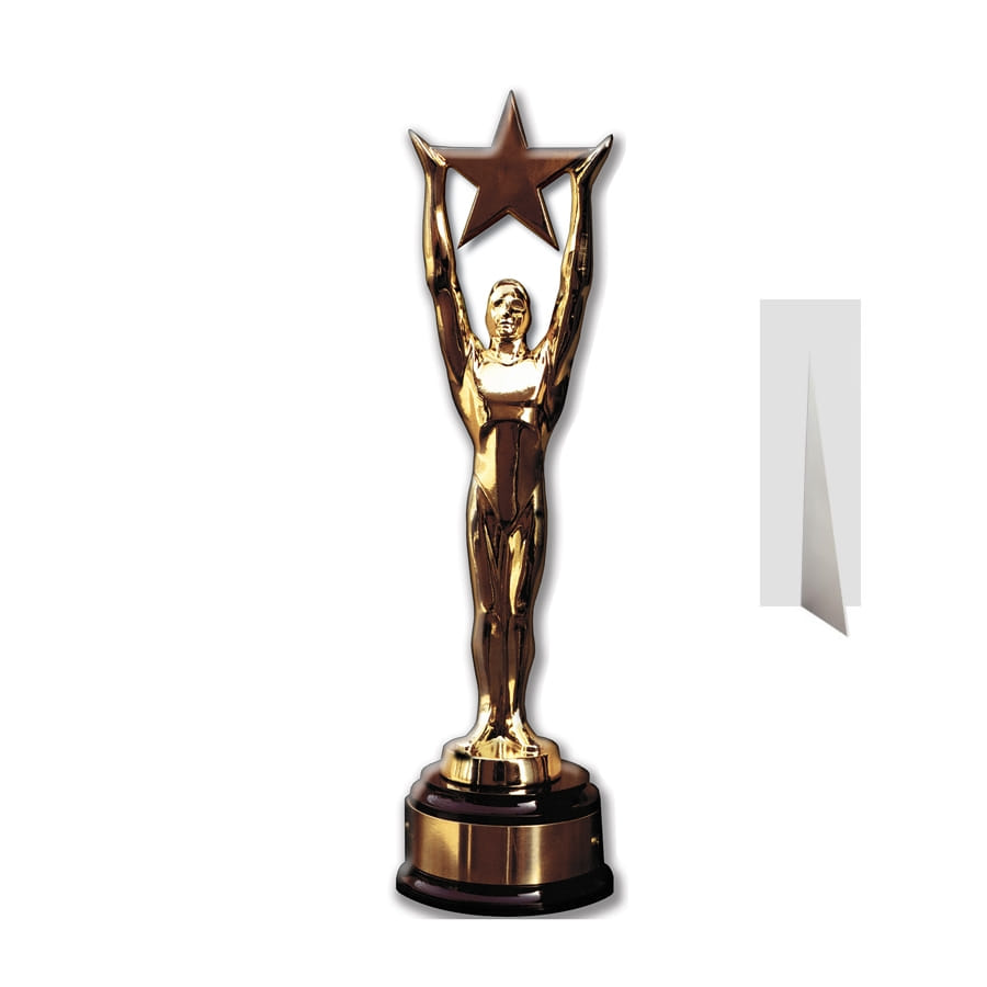 Nous vous décernons cette magnifique silhouette de trophée étoilée géante en carton, de couleur dorée, une parfaite imitation des "Oscars", pour une très belle soirée Cinéma. Cette silhouette très haute de 183 cm est une décoration qui ne passera pas inaperçue et ne manquera pas d'être appréciée par tous les invités.