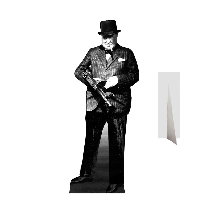 Pour un projet scolaire, une exposition sur des personnages historiques ou tout autre événement relatif à la politique, voici une silhouette de Winston Churchill en carton plat mesurant 182 cm. on y voit le célèbre personnage porter un costume noir à rayures avec noeud et pochette, une mitrailleuse à la main et un cigare à la bouche.