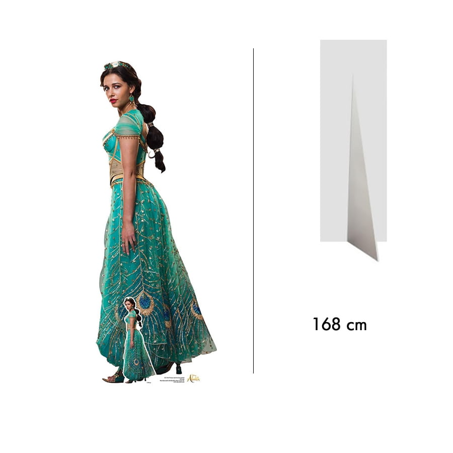Mesurant environ 168 cm de haut et environ 63 cm d'envergure, cette déco est faite en carton et représente la princesse Jasmine vêtue d'une longue robe bleu turquoise décorée de dorures et d'arabesques.