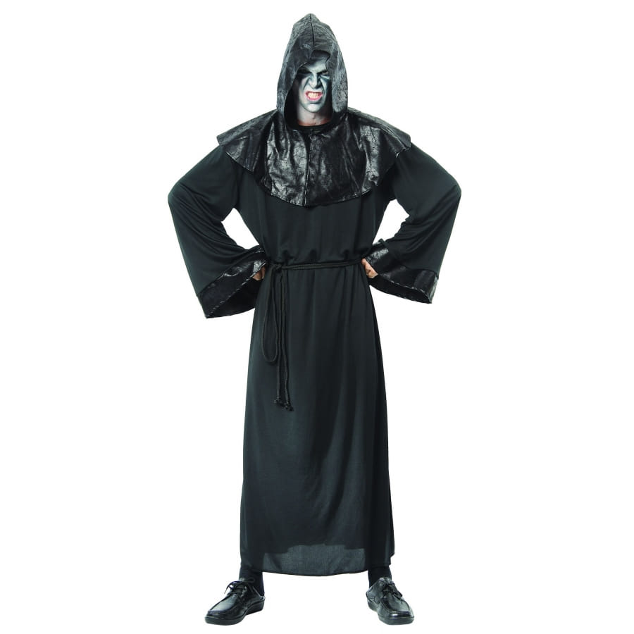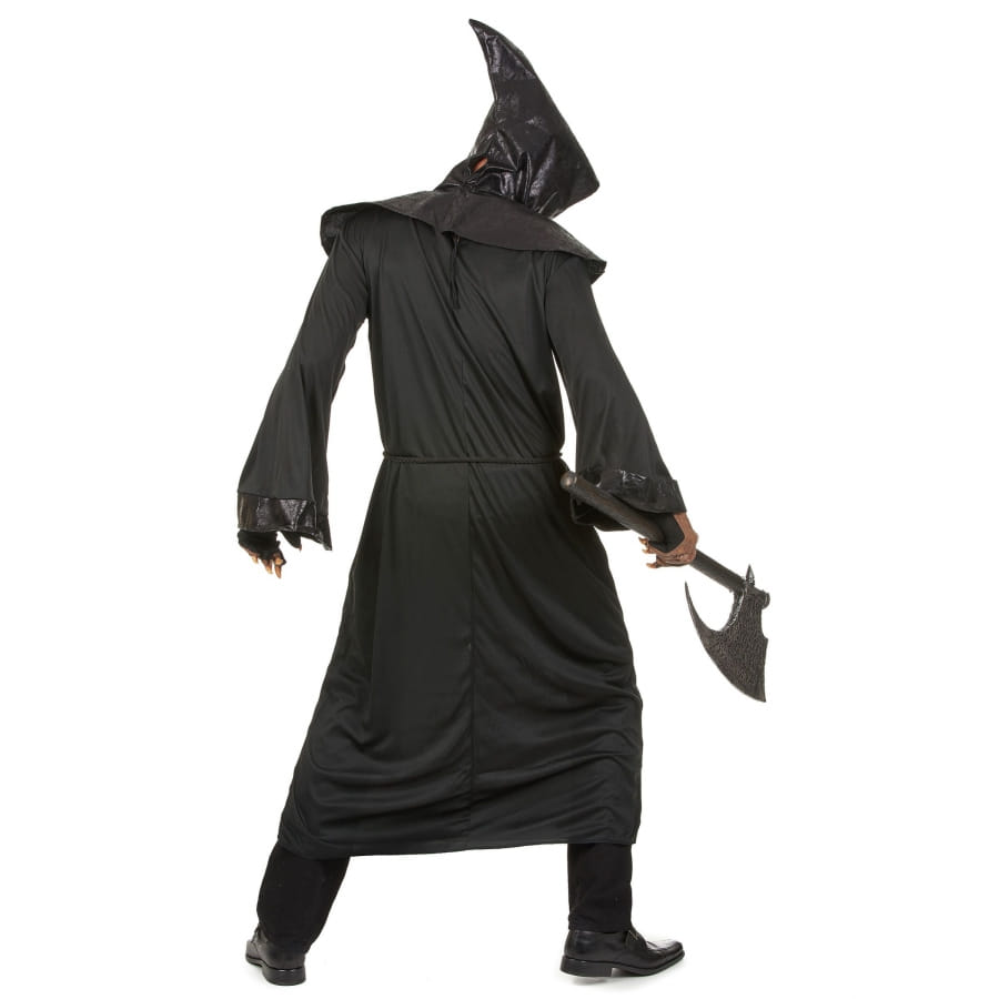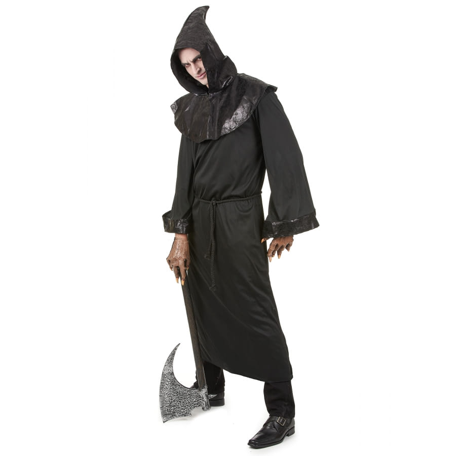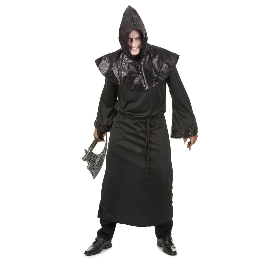 Messieurs, si vous voulez un costume qui sort du lot à l'occasion de la fête des morts, nous avons l'article que vous recherchez. En effet, nous vous proposons le sinistre costume de bourreau des ténèbres. Il reste disponible sur notre site. Ce déguisement de coupeur de tête se présente sous la forme d'une longue robe noire. Elle est pourvue d'une capuche qui lui donne encore plus un côté macabre. Ses manches longues évasées et sa coupe large confèrent un meilleur confort. Elle présente également un grand col arrondi, avec un effet lustré. Cette robe est fabriquée dans un tissu satiné léger et fluide. Si vous l'enfilez, vous serez paré pour couper les têtes que vous croiserez à halloween !