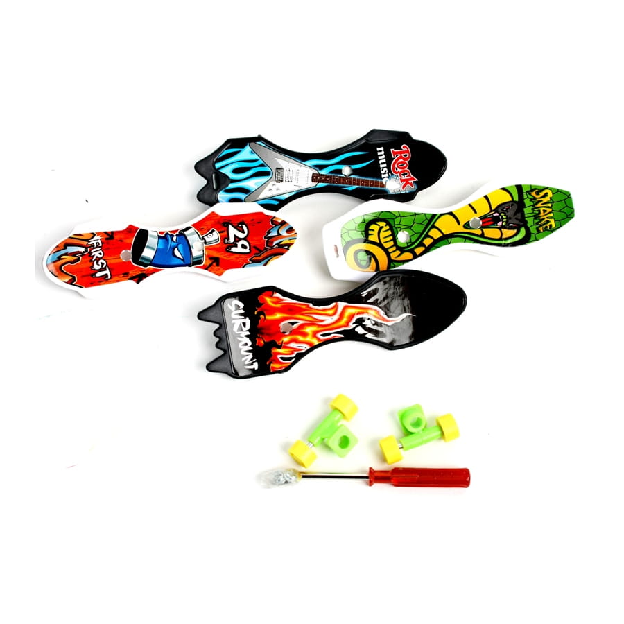 Quand vous vous ennuyez chez vous parce que le temps ne vous permet pas de faire du skateboard dehors, nous avons un petit quelque chose qui pourrait vous intéresser. Nous avons ces petits skates, très petits même, avec une longueur de 9 cm au minimum. Pourquoi sont-ils aussi petits ? Parce que ce sont des skates à doigts. L'ensemble est formé d'un skate, d'un tournevis, de vis et de roues, proposé en différentes couleurs. Vous pourriez vous occuper à les monter et les démonter, ça vous fera de l’entraînement. Lors de la commande, vous n'aurez ni le choix du modèle, ni de la couleur.