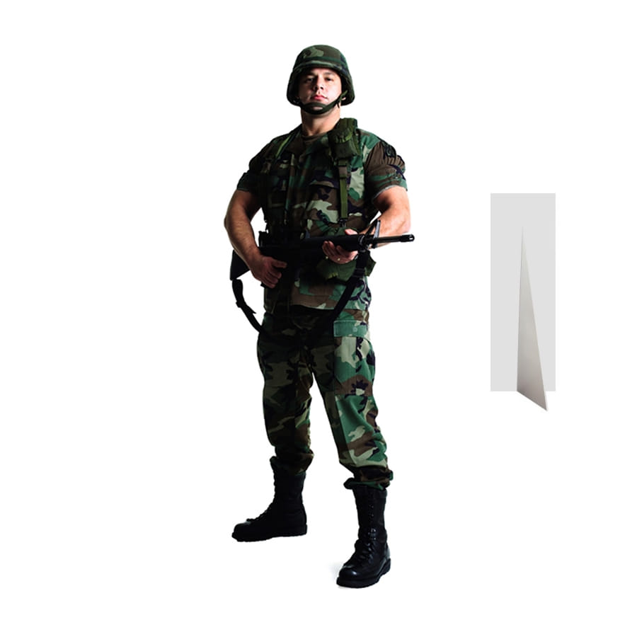 Ce soldat Américain en carton plat taille réelle représente un vrai soldat américain, en grandeur nature, muni de son arme et de son uniforme vert. La silhouette mesure 183 cm de hauteur, très voyante pour une décoration sensationnelle et réussie le temps d'une soirée à thème Guerre, par exemple.