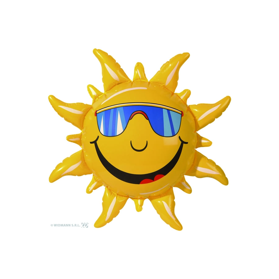 Soleil gonflable de couleur jaune avec visage souriant et lunettes de soleil bleues. Cet accessoire mesure 60 centimètres. Rien de tel qu'un énorme soleil pour créer une atmosphère tropicale ou exotique.