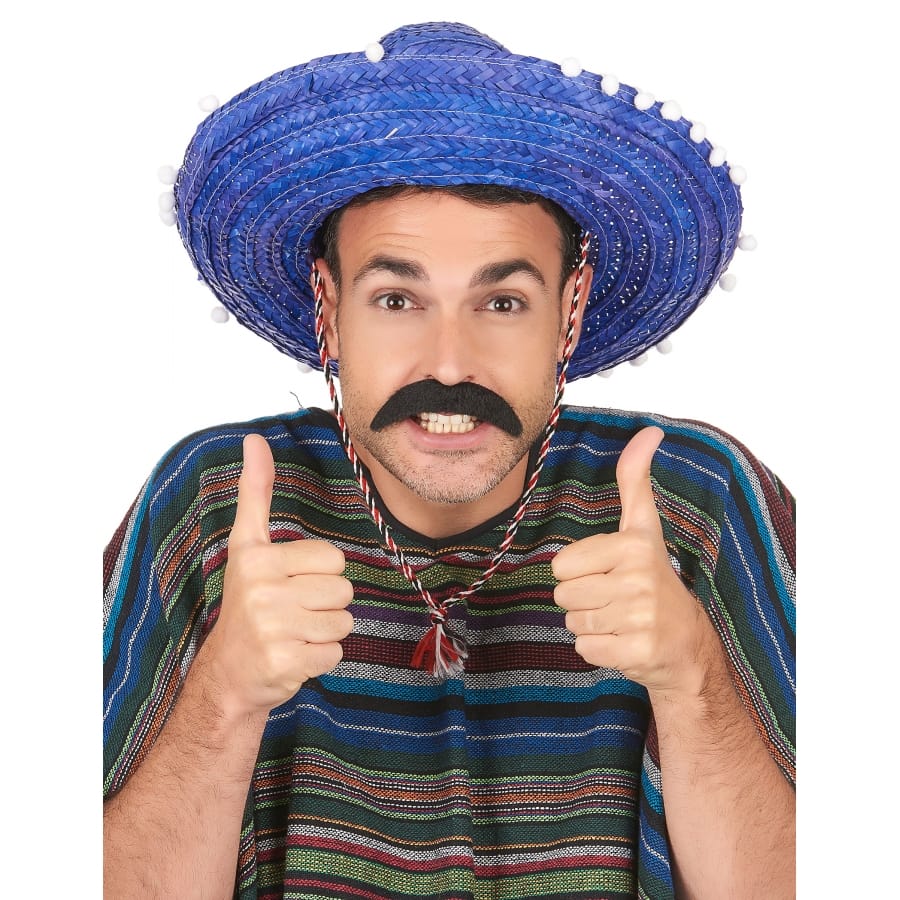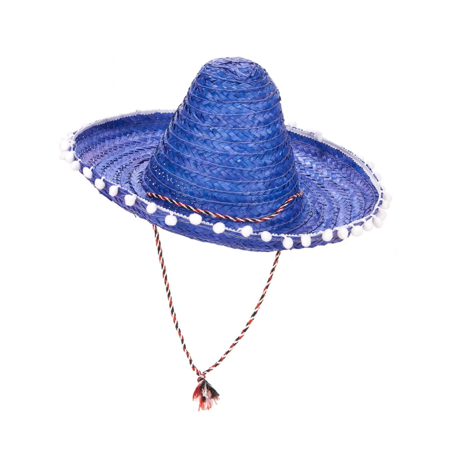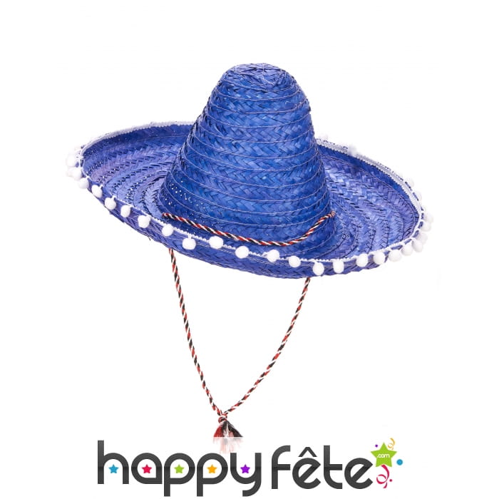 Nous vous dévoilons un sombrero bleu contours en pompons blancs.