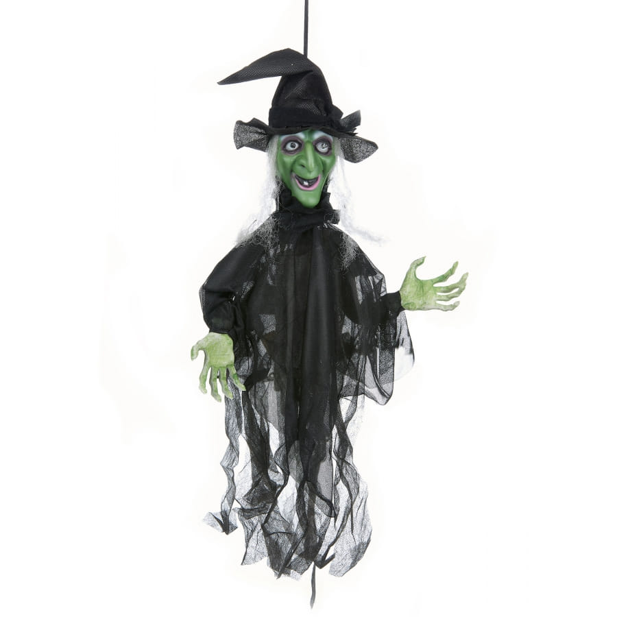 Cette Sorcière verte lumineuse et parlante à suspendre est une décoration parfaite pour compléter votre déco lors d'une fête à thème.