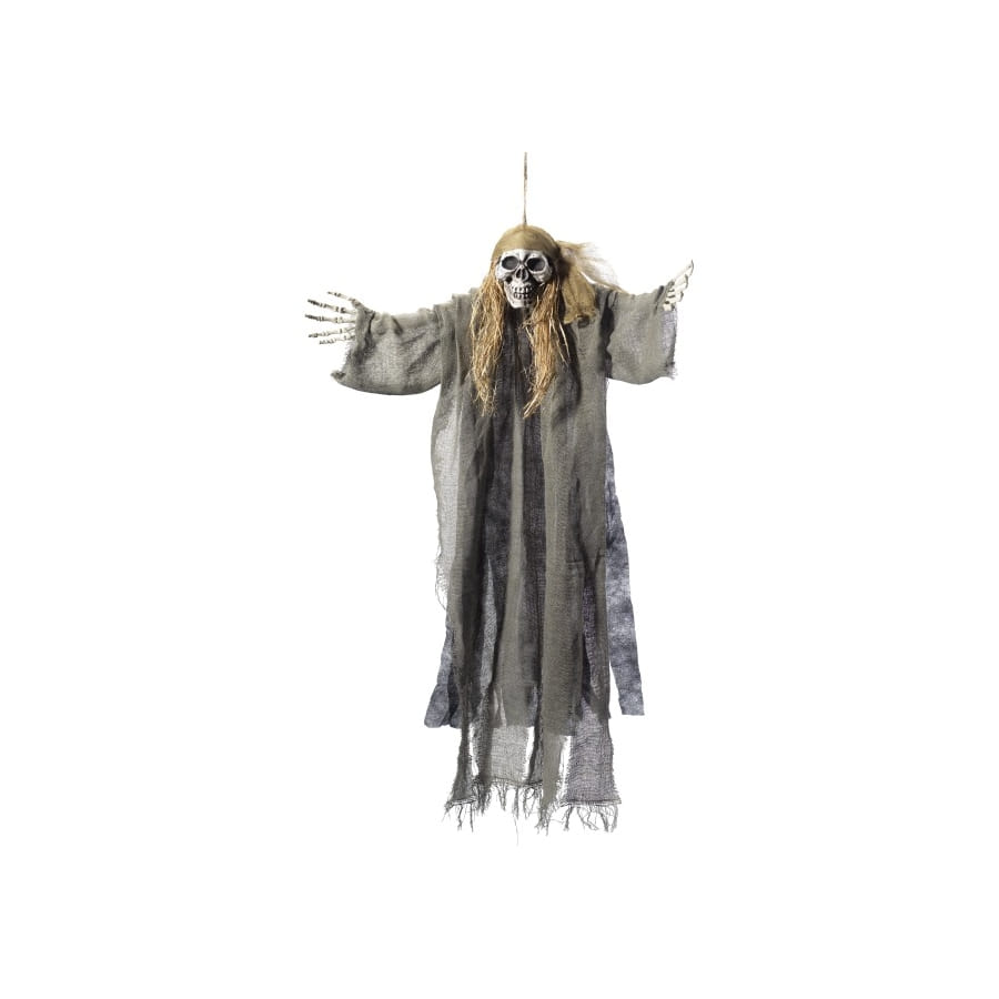 Accrochez le spectre pirate à suspendre de 90cm pour faire croire à des apparitions durant la fête d'halloween. Cet objet de décoration virevoltera dans l'air et bougera comme s'il s'agissait d'un vrai fantôme de pirate. Sa robe en mousseline verte, virant au gris rajoutera du mouvement à l'ensemble. Quant à la tête de mort qui le compose, elle porte un bandeau de pirate et est pourvue de cheveux pour renforcer le côté effrayant.