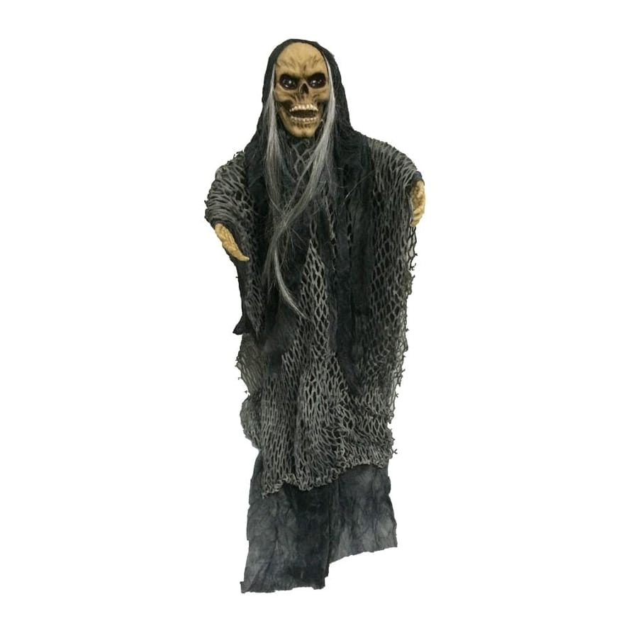 Vivez un Halloween hanté grâce à ce spectre squelette. Mis à part vos invités déguisés, quelques monstres seront aussi conviés à la soirée. Et ce squelette articulé en fait partie. Il mesure 90 cm, s'habille en noir et est doté de cheveux sur le crâne. Utilisez-le à titre décoratif en le posant par terre, ou en l'accrochant grâce à un parapluie qui vous sera fourni. L'article existe en différents modèles mais vous ne pourrez pas choisir le vôtre à la commande. A noter que ce fabuleux squelette crie, hurle, bouge, et ses yeux s'illuminent au son de ses hurlements. Ces effets spéciaux vont épater tous vos amis !