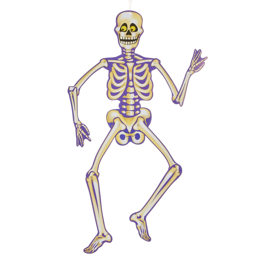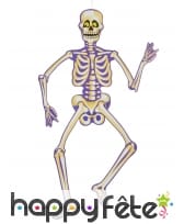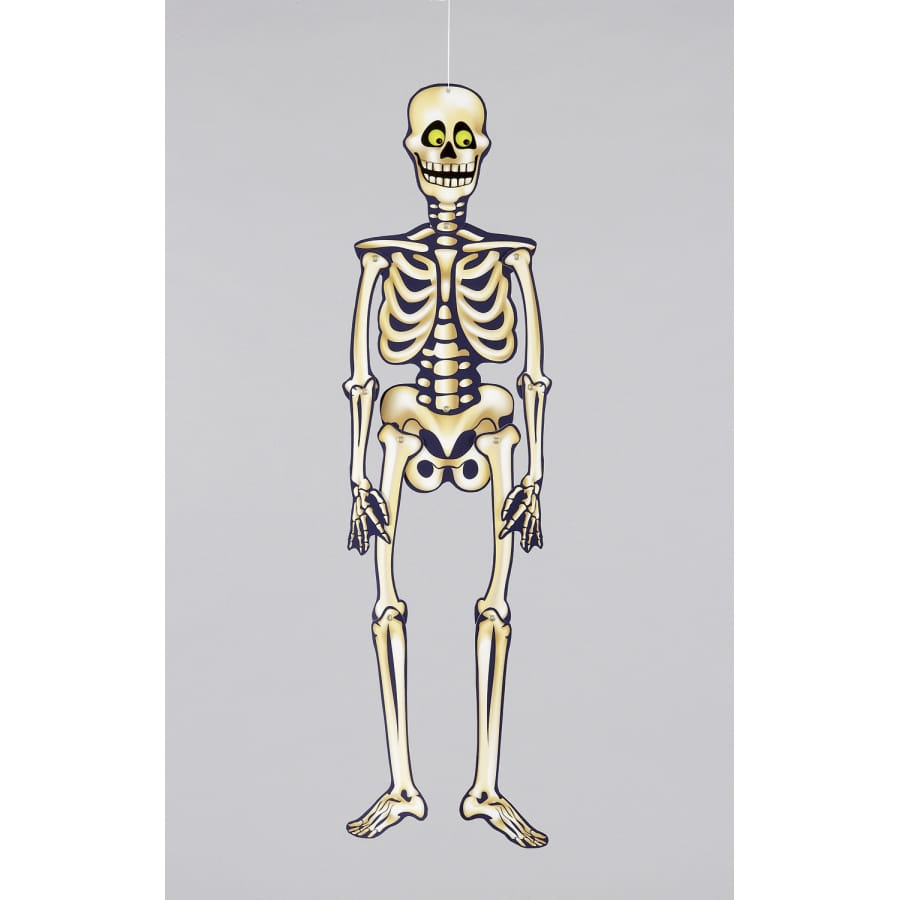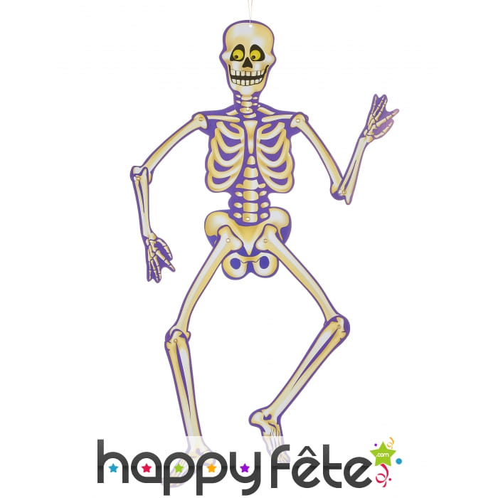Il s'agit d'un squelette en carton, avec un visage souriant et des yeux rigolos.