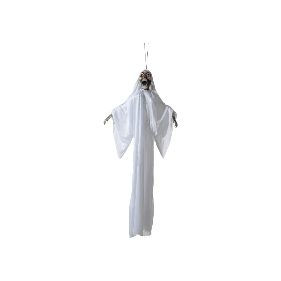 Le squelette fantôme blanc à suspendre, yeux lumineux est une déco à accrocher pour la fêtes des morts. Il s'agit d'un squelette terrifiant, avec des yeux rouges vifs qui s'allument grâce à un générateur intégré dans l'ensemble. Il peut aussi produire des sons avec un tel dispositif. Habillé d'une longue robe blanche très large, il vous fera trembler de peur. Une corde permet de le suspendre au plafond ou à l'endroit de votre choix.